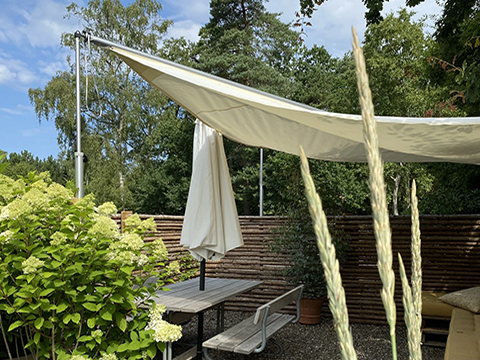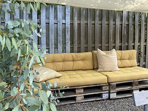 B&B haven er indrettet med bænke og sofa.